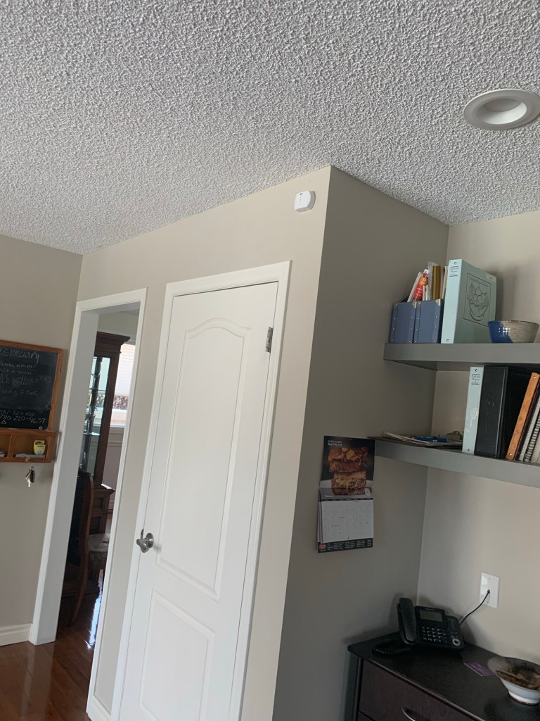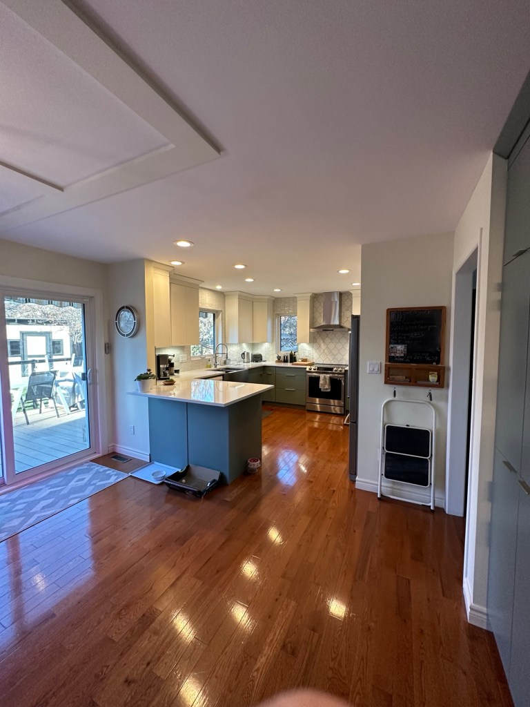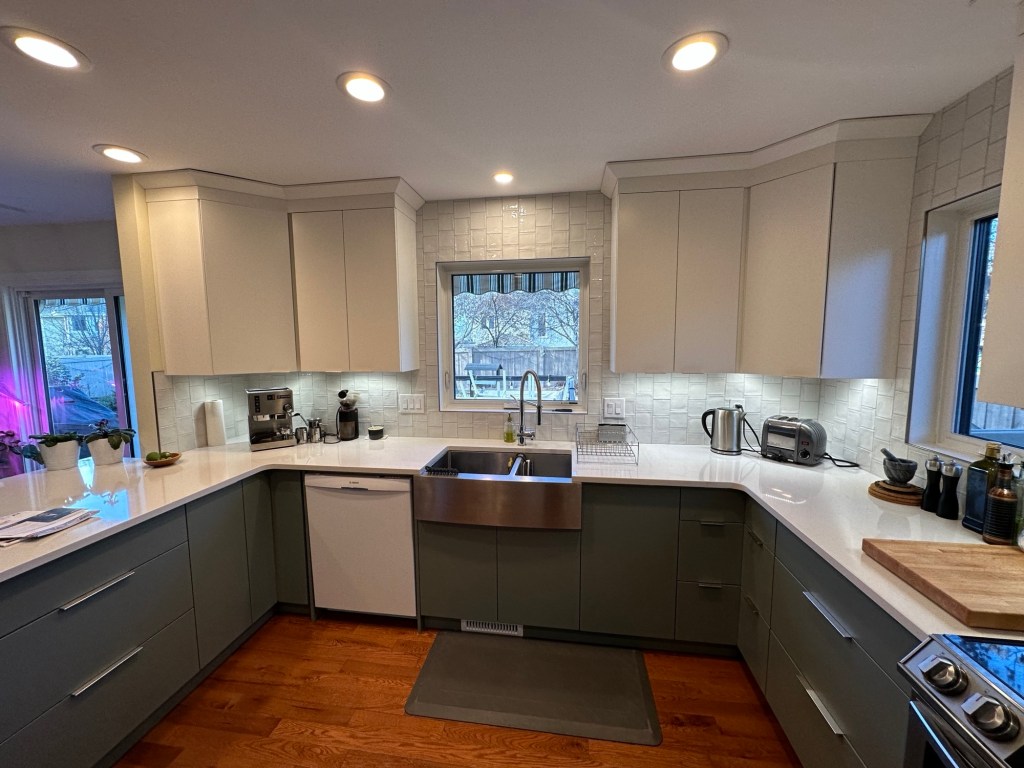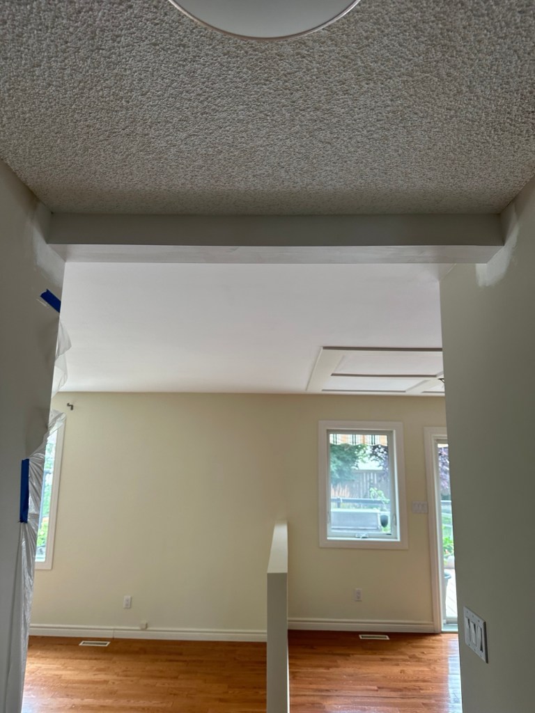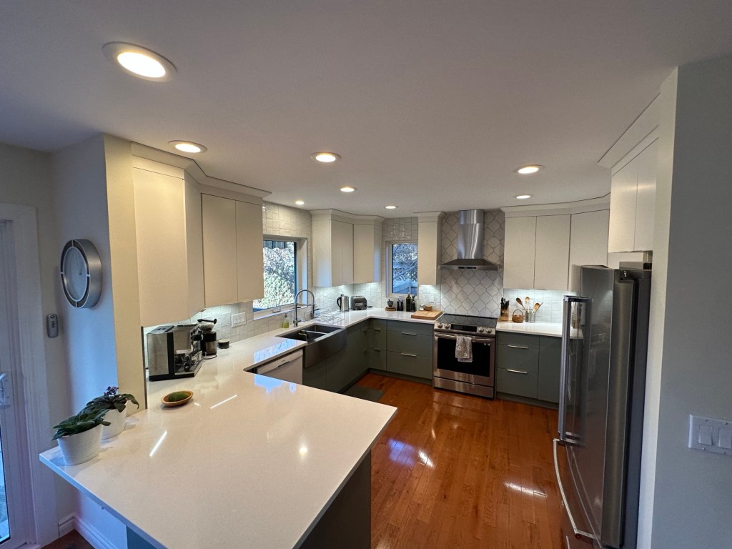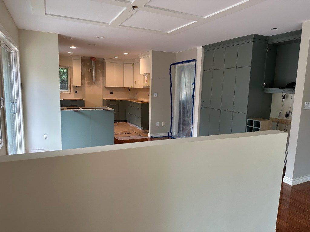This project in the heart of Edmonton’s Henderson Estates community called for removal of the 1990’s styled bulkheads framed down to fill the void on top of the existing builder cabinets. Consequent repair, blending and repainting of the attached living room ceiling including construction of a faux bulkhead to demarcate an adjoining hallway was required, all while retaining not only the as is condition of the continuous engineered hardwood flooring but also our client’s existing quartz countertops and stainless steel apron sink.