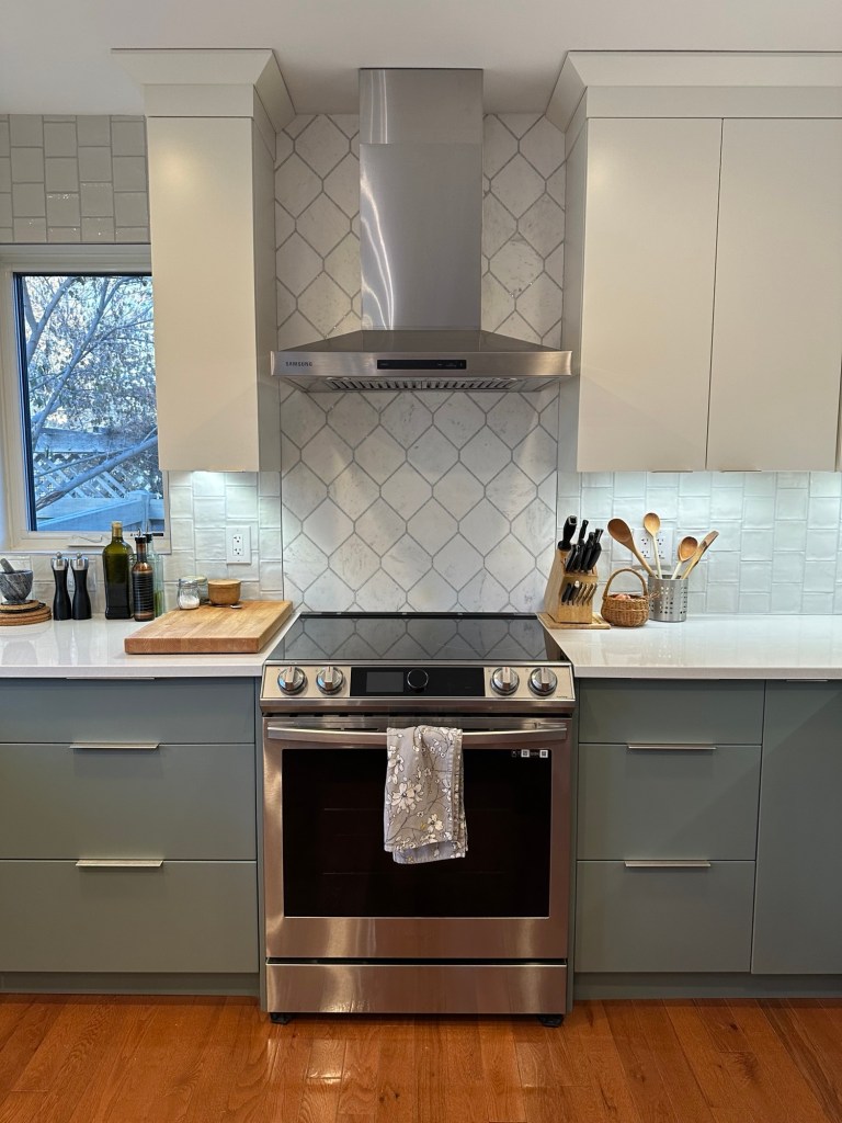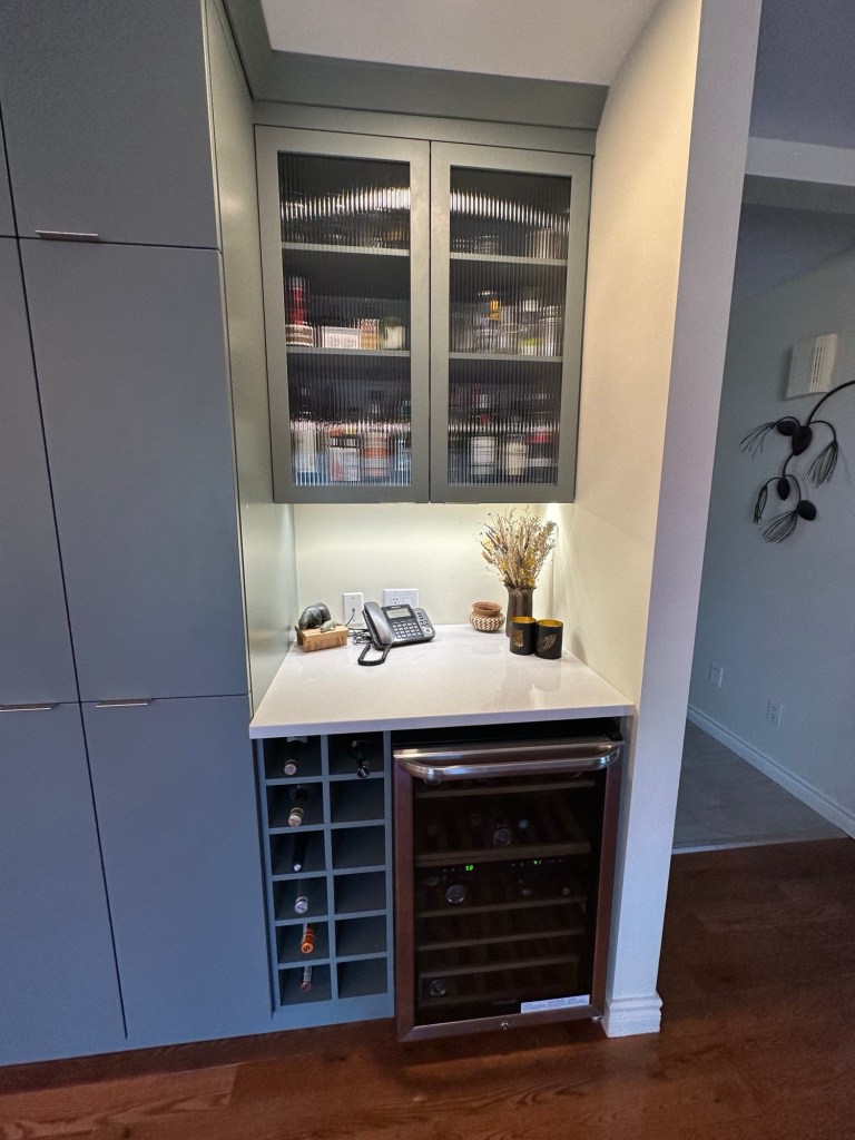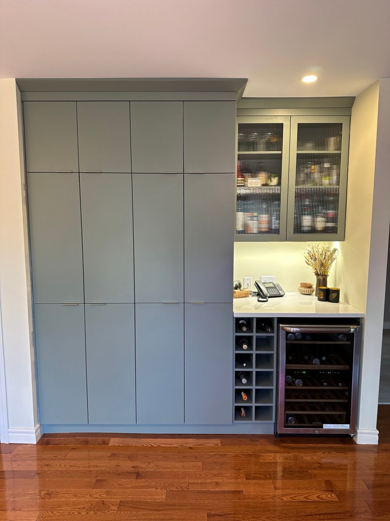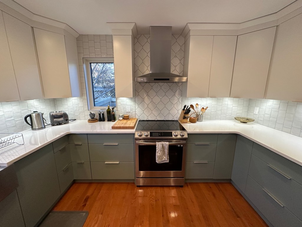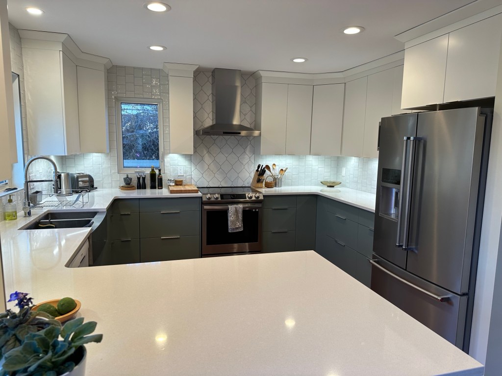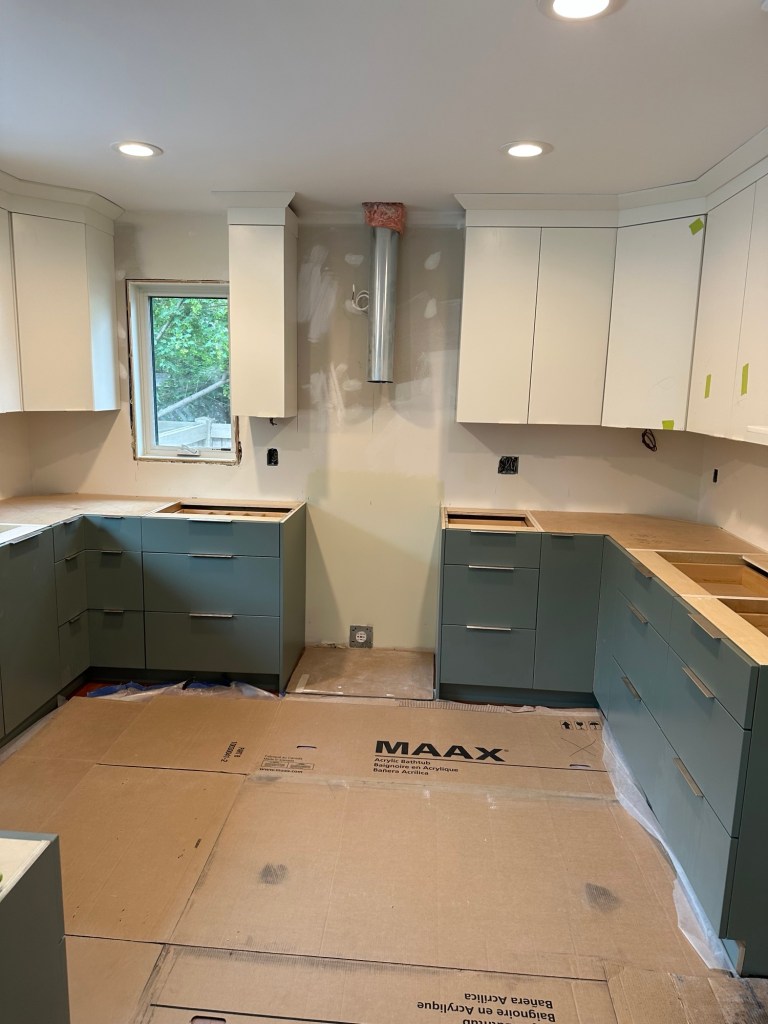 - Two-tone flat stock vinyl wrap doors – base cabinets in ‘Jasper Green’ & 36”uppers to ceiling + shaker style crown + riser in ‘Oxford White’
