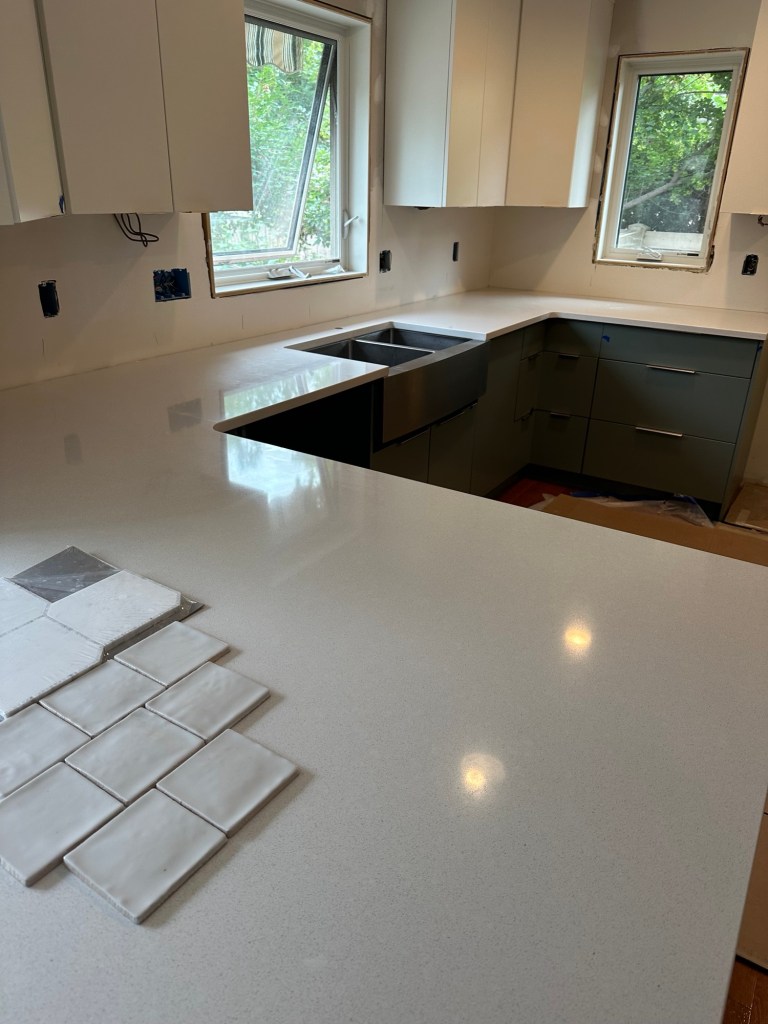 - 1-1/4″ ‘Snow White’ solid surface quartz countertops with/ 3cm eased edge