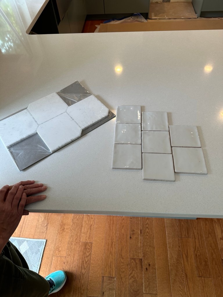 - 50/50 vertical ‘Coast Linen 4×4 Glossy’ Ceramic tile backsplash
