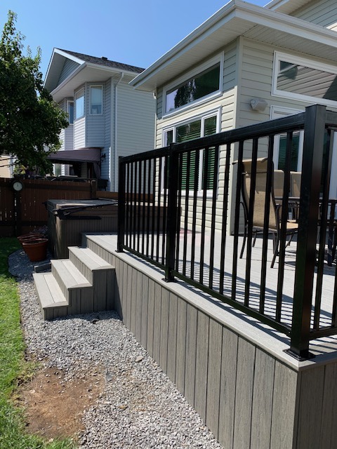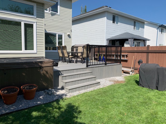 The existing aged surface of this deck was removed and the layout was reconfigured. Framing reinforcements and bracing were added to help fortify the existing deck structure prior to the composite decking & skirting installation. Boxed stairs & aluminum railing complete the finished look. Pressure treated pillars and crossmembers complete with retractable privacy blinds make up the pergola area that covers the hot tub.