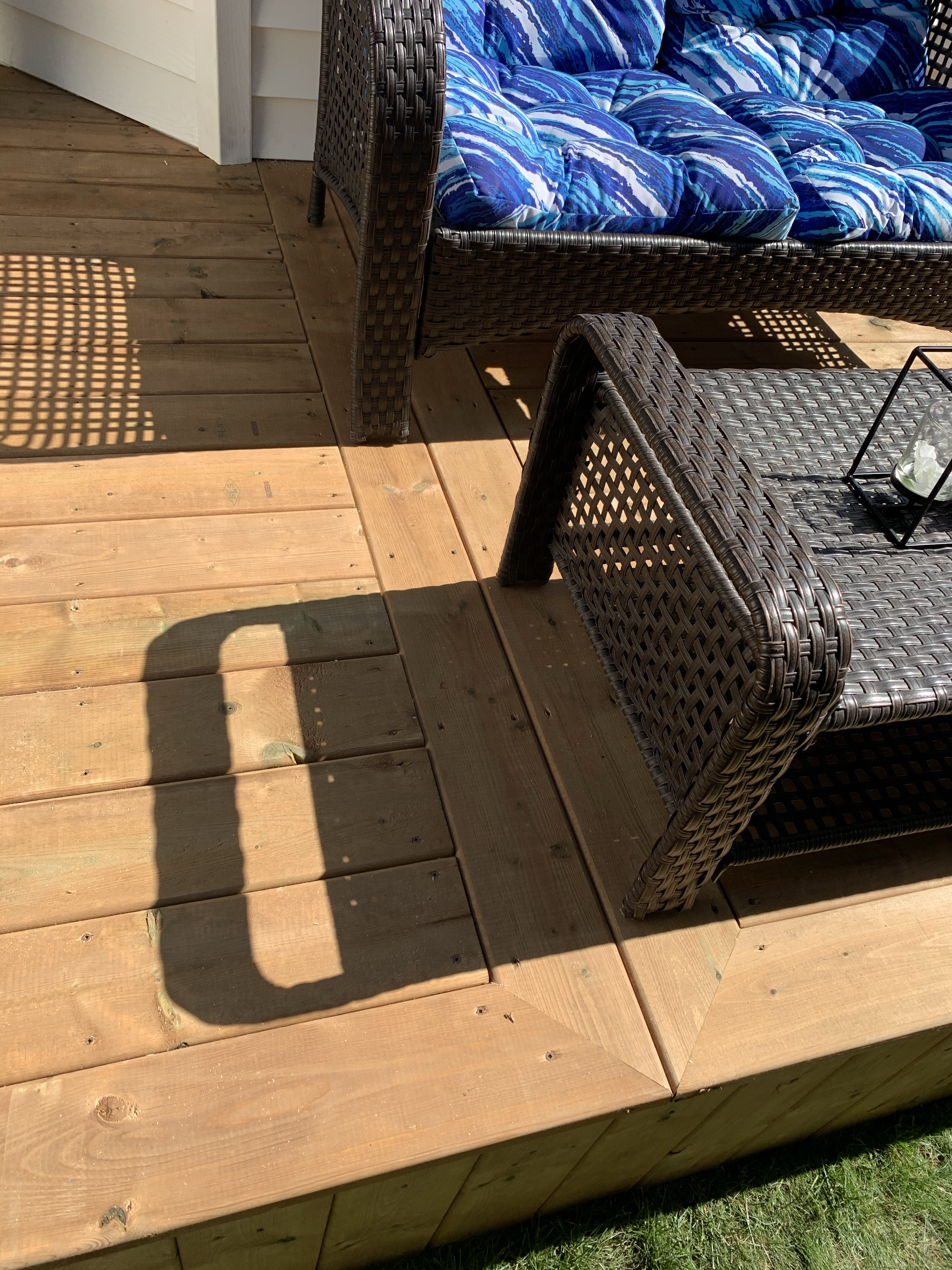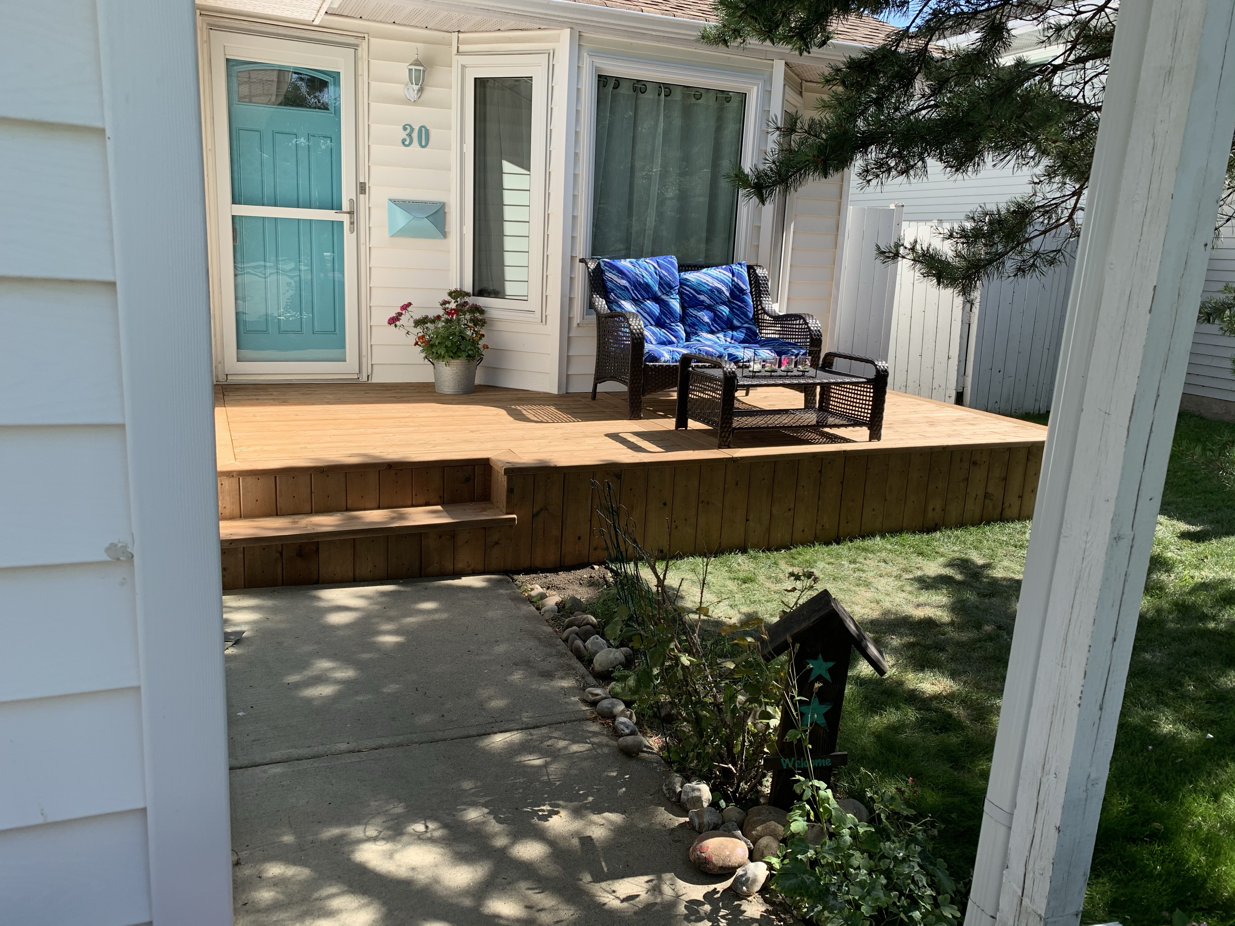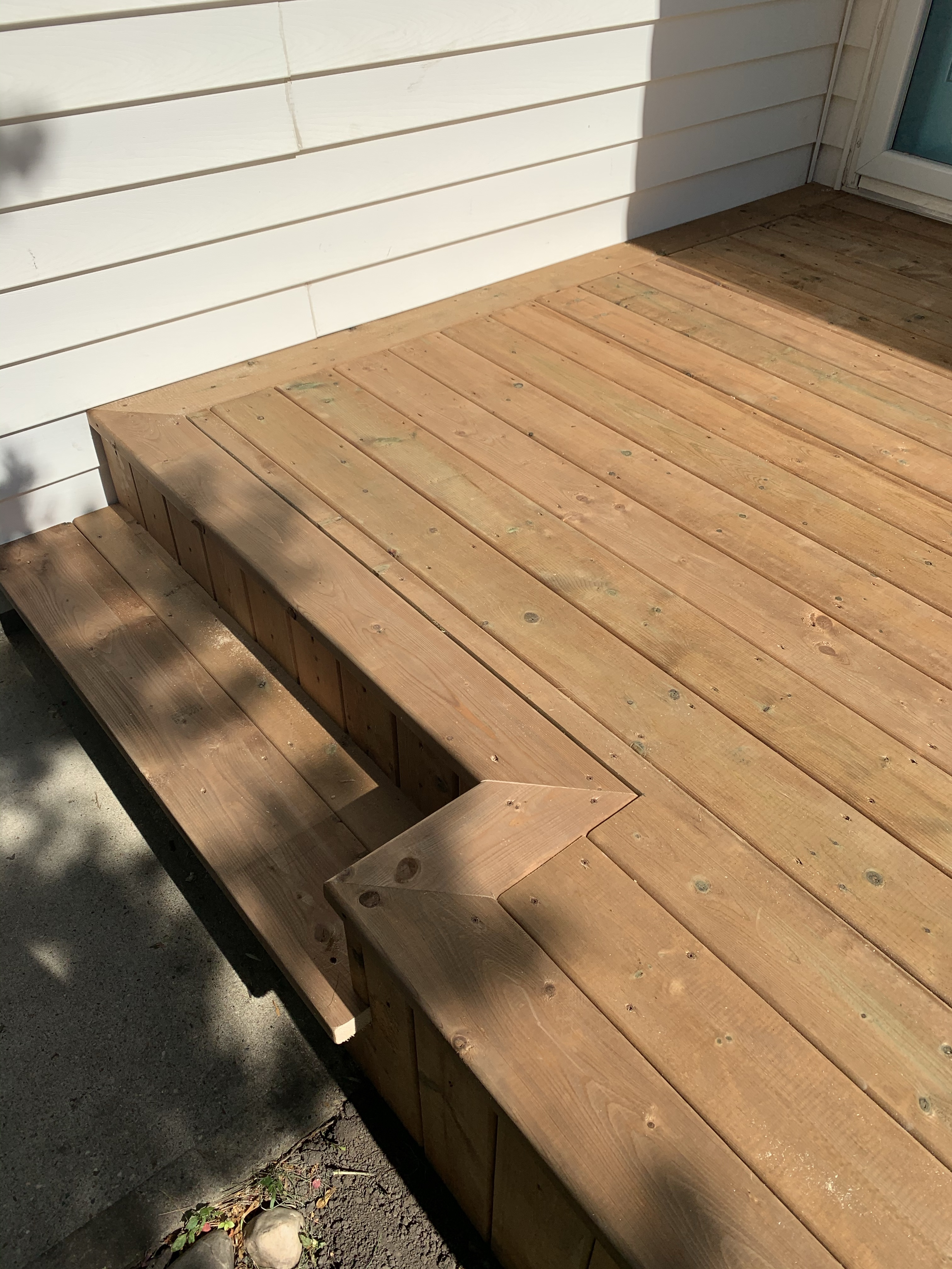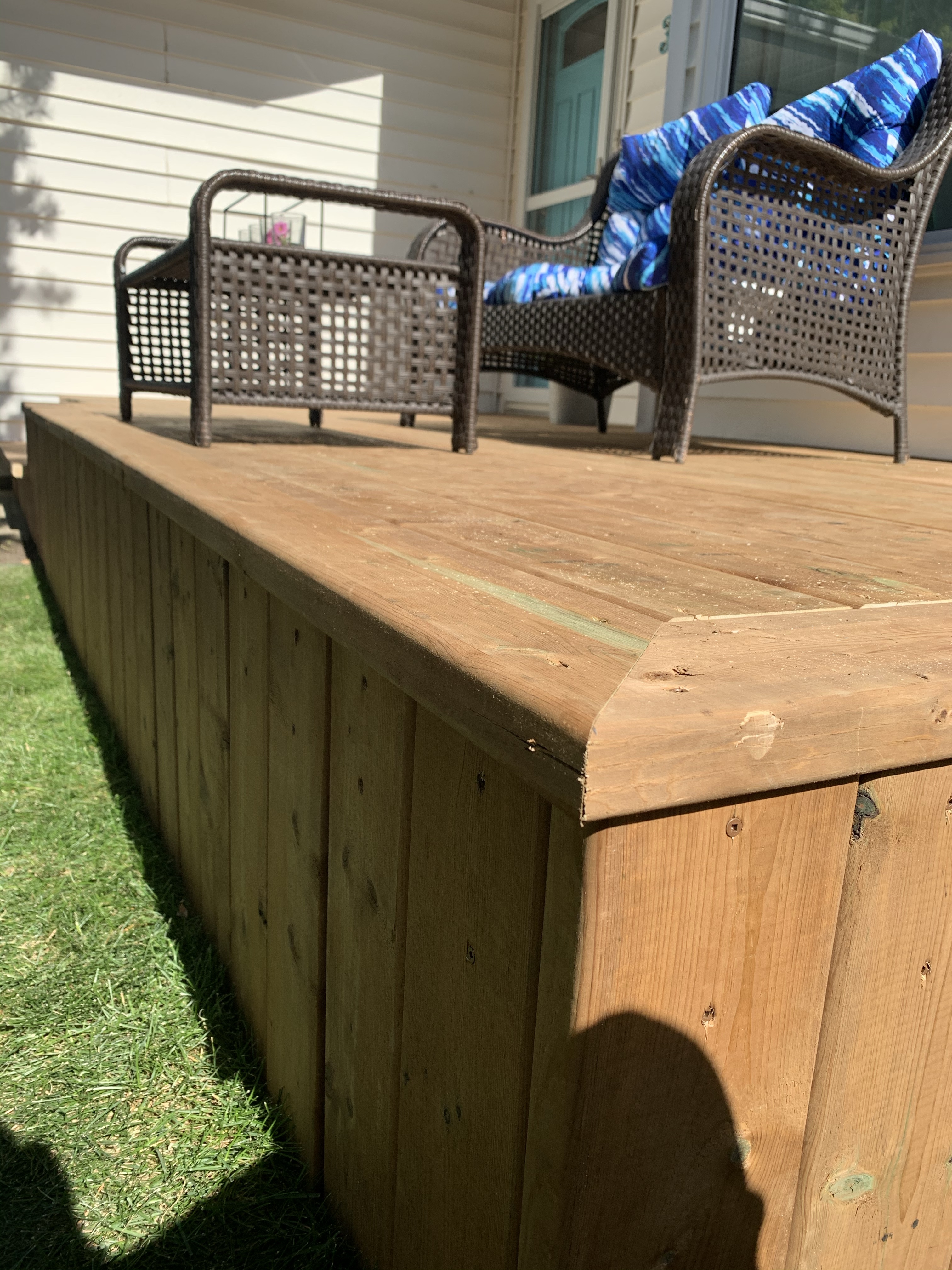 This front porch, recessed step and skirting were constructed with pressure treated ‘Sienna Brown’ lumber and designed with a spine and picture frame border to add some character and clean lines.